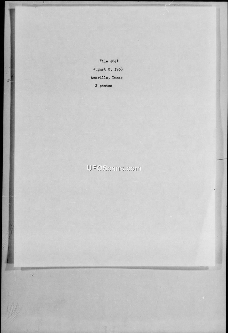 This document, identified as File 4241, serves as a brief administrative record concerning a sighting event that occurred in Amarillo, Texas, on August 2, 1956. The document is minimal in nature, functioning primarily as a cover sheet or index entry for two photographic enclosures. The text explicitly notes the date of the event and the location, while confirming the inclusion of two photographic images. The second page of the document contains the two photographs themselves, which appear to be dark, low-light images showing a small, bright, vertical light formation against a black background. Each photograph is marked with the word 'bottom' and an arrow, indicating the orientation of the images. No further narrative, witness testimony, or official analysis is provided within the document to explain the nature of the objects captured in the photographs or the circumstances surrounding the sighting.