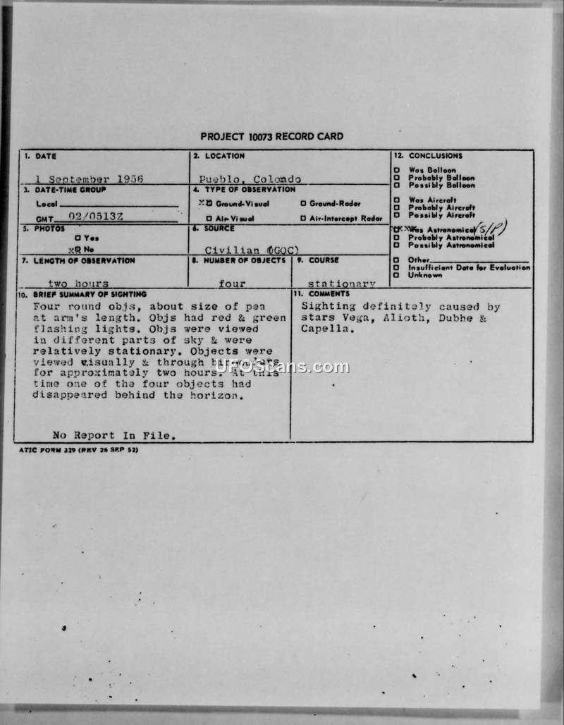This document consists of a series of Project 10073 record cards and associated military teletype messages detailing three separate Unidentified Aerial Phenomena (UAP) sightings reported in Pueblo, Colorado, during September 1956. The first incident, occurring on 1 September 1956, involved four round objects with red and green flashing lights that remained relatively stationary for two hours. These were observed through binoculars and were officially concluded to be the stars Vega, Alioth, Dubhe, and Capella. The second incident, reported on 17 September 1956, involved a single oblong white object, described as the size of a basketball at arm's length. The witnesses, an employee of the Pueblo Ordinance Depot and a housewife, observed the object for two minutes as it traveled from the east to the southwest. The official evaluation determined this to be an aircraft. The third incident, occurring on 24 September 1956, involved a single round object described as the size of a washtub at arm's length. This object was observed for thirty seconds as it traveled north. This sighting was also evaluated as an aircraft. The documentation includes formal military communications from the 462nd AISS at Ent Air Force Base, signed by 2/LT Joseph A. Machyowsky, which provide technical descriptions of the objects, the observers' locations, and the meteorological conditions at the time of the sightings. The reports consistently follow the standard format for Project 10073, emphasizing the systematic collection and evaluation of UAP data by the Air Technical Intelligence Center during this period.