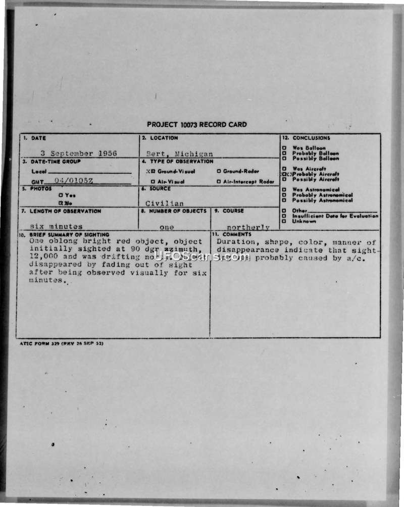 Project 10073 Record Card — Bert, Michigan, 3 September 1956