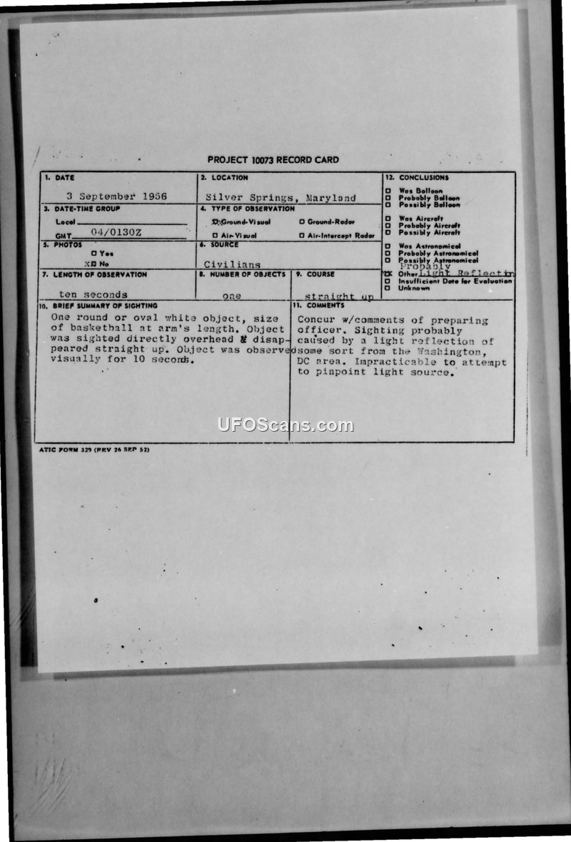 A 1956 report detailing a sighting of a white, basketball-sized object in Silver Spring, Maryland. The Air Force concluded the event was likely a light reflection from the Washington, DC area.