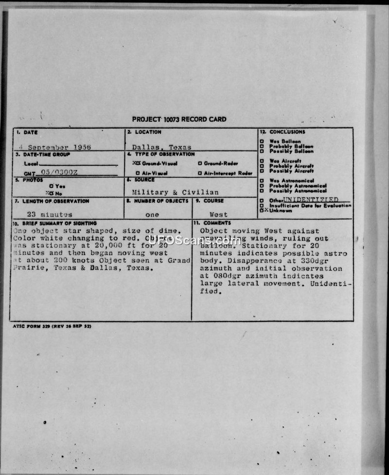 Project 10073 Record Card — Dallas, Texas, 4 September 1956