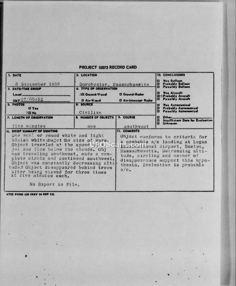 This document is a Project 10073 record card detailing a sighting that occurred on September 6, 1956, in Dorchester, Massachusetts. The observation, made by a civilian source, lasted for five minutes. The witness described a single object that was oval or round in shape and appeared white or light bluish-white in color, with a size comparable to the planet Mars. The object was observed traveling at the speed of a jet below the cloud layer. Its flight path was generally southwest, during which it performed a complete circle before continuing in a southwest direction. The witness noted that the object was constantly decreasing in altitude and eventually disappeared behind trees after being observed for three separate intervals of five minutes each. The official evaluation concluded that the object was likely an aircraft. The reasoning provided for this assessment was that the object's behavior—specifically its decreasing altitude and circling pattern—conformed to the criteria for an aircraft landing at Logan International Airport in Boston, Massachusetts. The record card notes that there was no additional report on file regarding this incident.