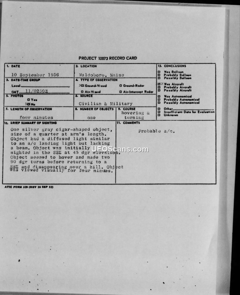 Project 10073 Record Card — Waldoboro, Maine, 10 September 1956