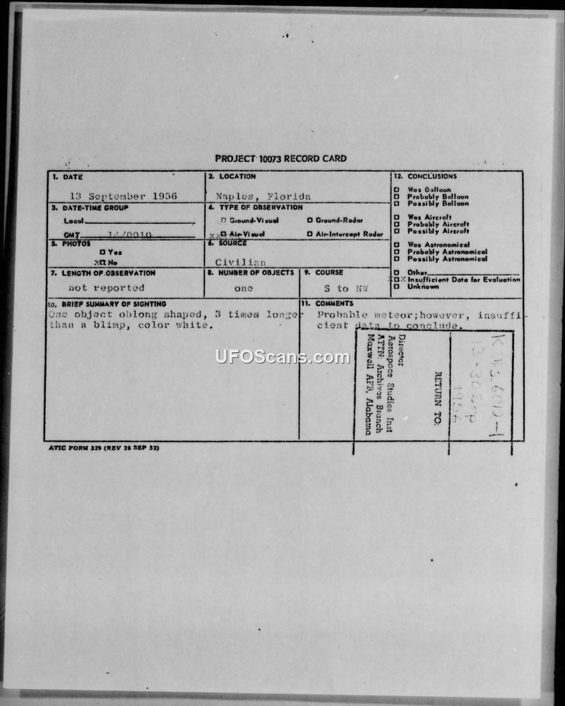 A civilian in Naples, Florida, reported a large, white, oblong object moving at high speed on September 13, 1956. The Air Technical Intelligence Center concluded it was a probable meteor due to insufficient data.