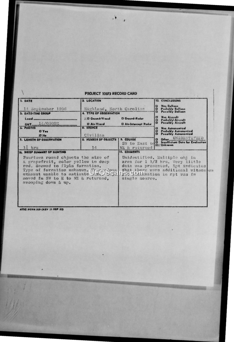 Project 10073 Record Card — Highland, North Carolina, 14 September 1956