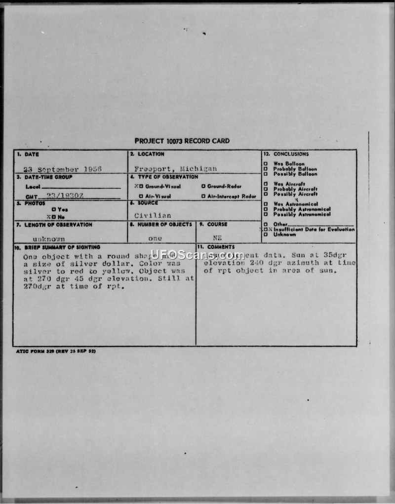 Project 10073 Record Card - Freeport, Michigan - 23 September 1956