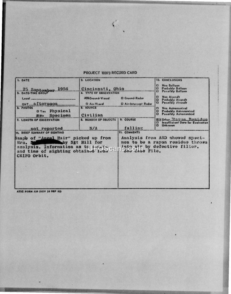 The Air Force investigated 'angel hair' samples submitted by CRIFO director Leonard Stringfield. ATIC analysis identified the material as industrial rayon waste from a local factory, dismissing claims of extraterrestrial origin.