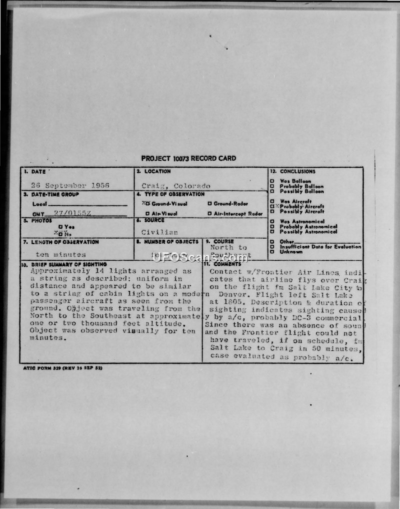 A sighting of fourteen lights in formation over Craig, Colorado, on 26 September 1956 was reported by four witnesses. Military investigators concluded the object was likely a commercial aircraft, despite the lack of audible engine noise.