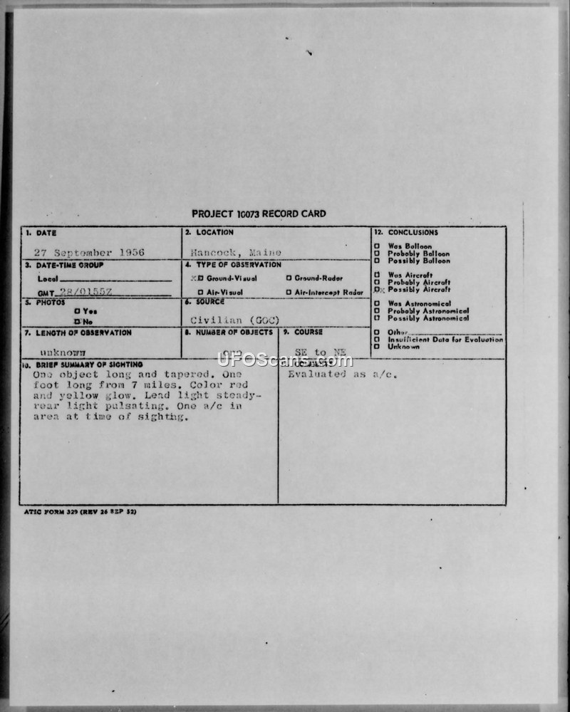 Project 10073 Record Card — Hancock, Maine, 27 September 1956