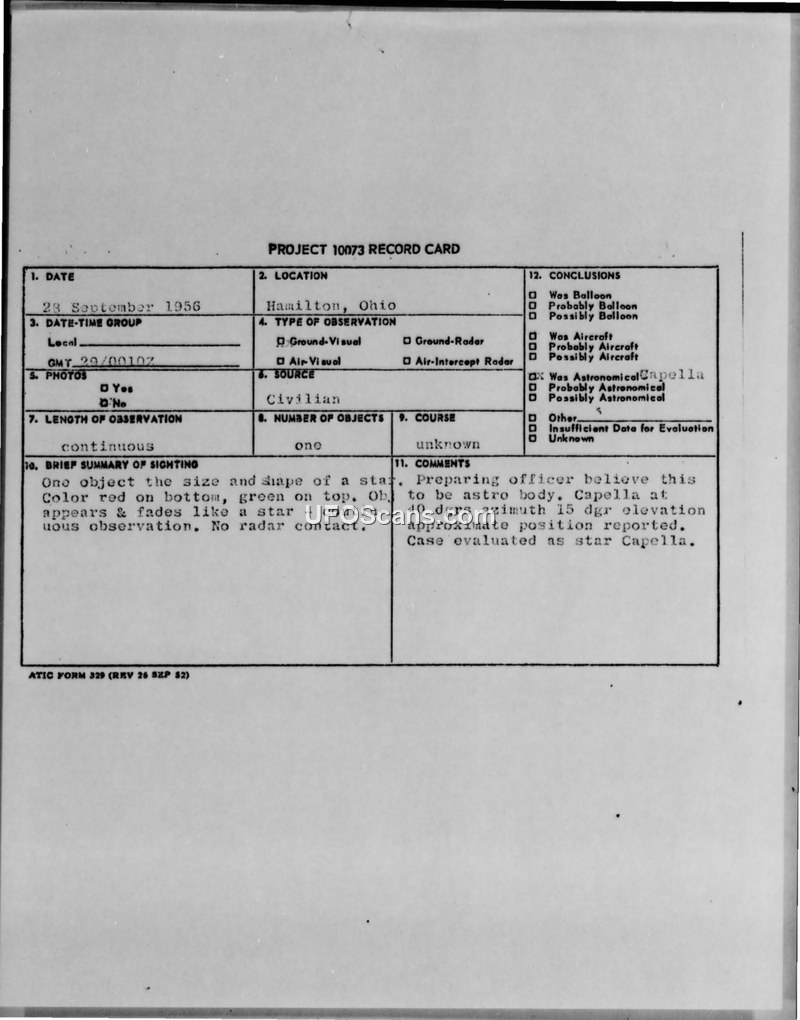 A civilian sighting in Hamilton, Ohio, on 23 September 1956 was investigated by the USAF. The object was identified as the star Capella.
