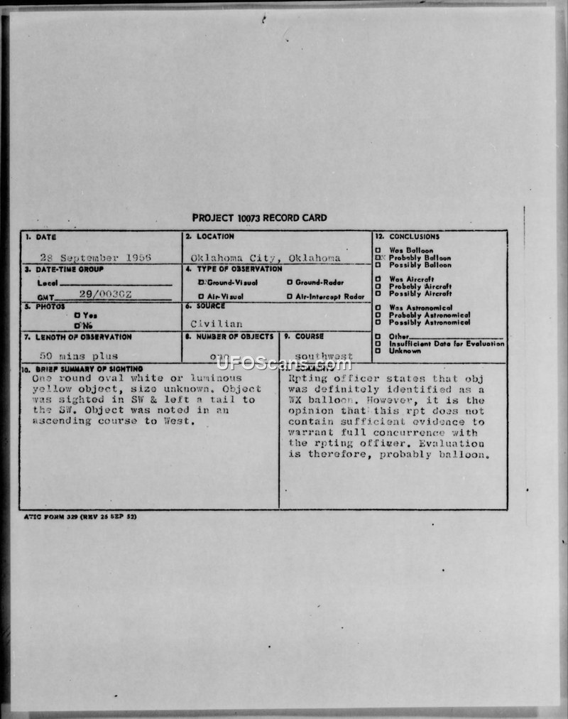 Project 10073 Record Card — Oklahoma City, Oklahoma, 28 September 1956