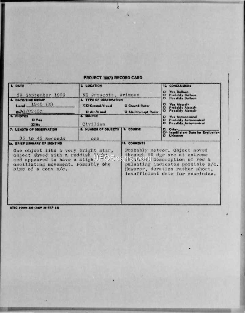 Project 10073 Record Card — Sighting near Prescott, Arizona, 29 September 1956