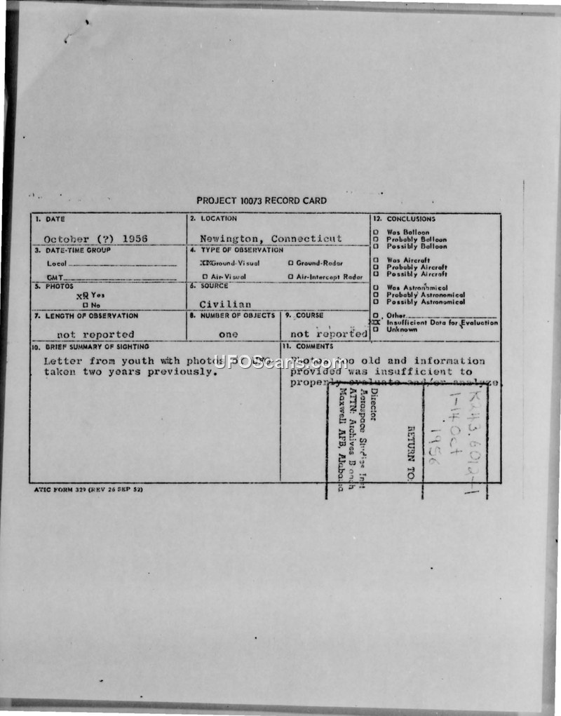 This document consists of a Project 10073 record card and associated correspondence regarding a UFO sighting reported by a youth from Newington, Connecticut. The witness, who was twelve years old at the time of writing in October 1958, submitted photographs of what they believed to be flying saucers. The witness stated that the photographs were taken two years prior, when they were ten years old. The witness explained that they had developed the film and printed the photos themselves, noting that one picture was a regular exposure where the object did not show up, while a subsequent overexposed shot captured the object. The witness also included a postscript stating they had no spectacular story to accompany the images. The Air Force, represented by Major Lawrence J. Tacker of the Public Information Division, acknowledged receipt of the letter and photographs on October 30, 1958. The official conclusion recorded on the Project 10073 card was that the photographs were too old and the information provided was insufficient to properly evaluate or analyze the sighting. The file includes the record card, the witness's original letter, and the formal response from the Air Force.