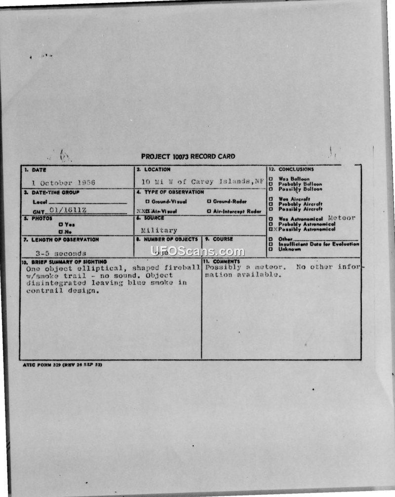 On October 1, 1956, at 1611Z, military personnel observed an unidentified aerial phenomenon ten miles west of the Carey Islands, Newfoundland. The object was described as an elliptical-shaped fireball that emitted no sound and left a smoke trail. During the observation, which lasted between three and five seconds, the object traveled in a straight line at an estimated speed of 700 to 1200 miles per hour. The witnesses reported that the object was orange-red in color and eventually disintegrated, leaving behind a blue-white smoke trail in a contrail design. The observation occurred under clear weather conditions with winds at 340 degrees at 15 knots. The report notes a low-pressure area centered at 74.45 N and 64.50 W, with low clouds at 3000 feet. The incident was documented on a Project 10073 record card and reported via teletype to various military commands, including the 64th Air Division at Pepperrell Air Force Base, the Air Defense Command, and the Air Technical Intelligence Center (ATIC) at Wright-Patterson Air Force Base. The official conclusion recorded on the document is that the phenomenon was possibly a meteor.