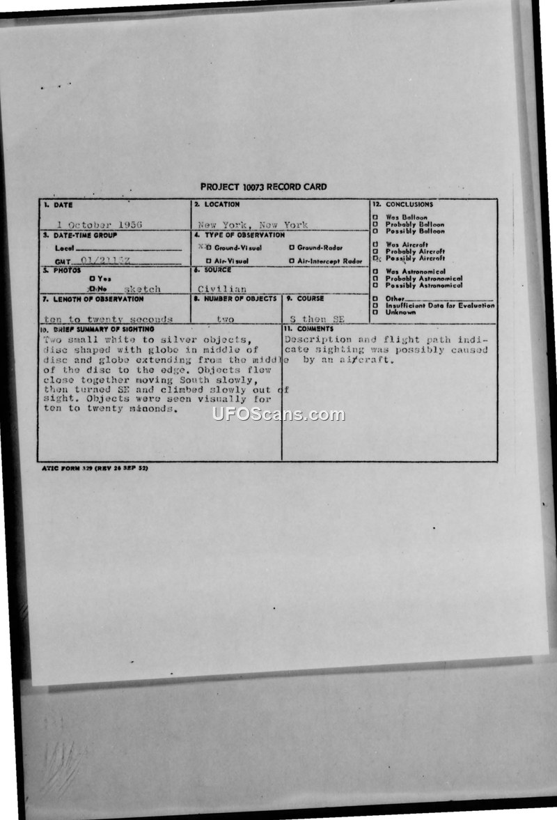 Project 10073 Record Card — Sighting of 1 October 1956, New York, NY
