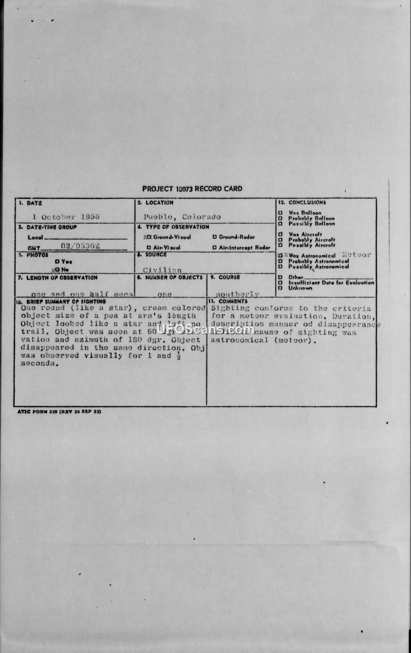 This document contains a collection of Project 10073 record cards and associated teletype messages documenting two separate UFO sightings in Pueblo, Colorado, during October 1956. The first incident occurred on 1 October 1956, involving a single cream-colored, star-like object observed for approximately one and a half seconds. The witness described the object as having the size of a pea at arm's length and noted it left no trail and made no sound. The official evaluation concluded that the sighting was a meteor. The second incident occurred on 26 October 1956 and involved a group of 20 to 30 bluish-green, round objects. Witnesses reported that the objects initially appeared in a spread V-formation before tightening into a V-formation, moving from the northeast to the southwest at a speed described as faster than a jet. These objects were observed for approximately ten seconds before disappearing into hazy clouds. The official conclusion for this second event was that the objects were likely a flight of high-flying migratory birds. The documentation includes the original record cards, which summarize the observations, and the subsequent military teletype messages sent between the 462nd AISS at Ent Air Force Base and the Air Technical Intelligence Center at Wright-Patterson Air Force Base. These reports were processed as part of the Air Force's ongoing investigation into unidentified aerial phenomena under Project 10073.