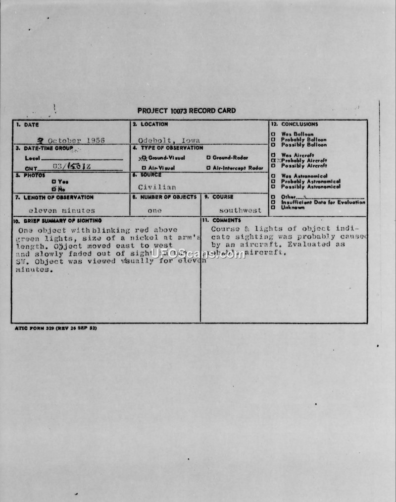 A 1956 sighting report from Odebolt, Iowa, describes an object with red and green lights observed for eleven minutes. The military investigation concluded the object was likely an aircraft.