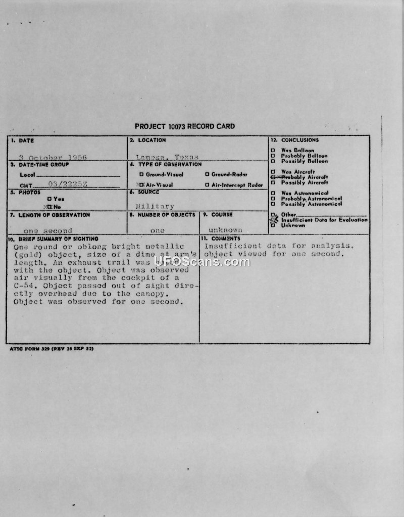 Unidentified Flying Object Report — Lamesa, Texas, 3 October 1956