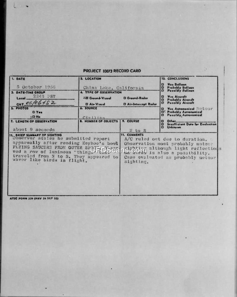 PROJECT 10073 RECORD CARD - Sighting at China Lake, California, 5 October 1956