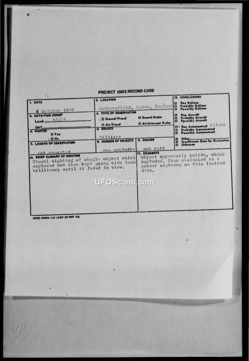 PROJECT 10073 RECORD CARD — Wethersfield, Essex, England, 6-7 October 1956