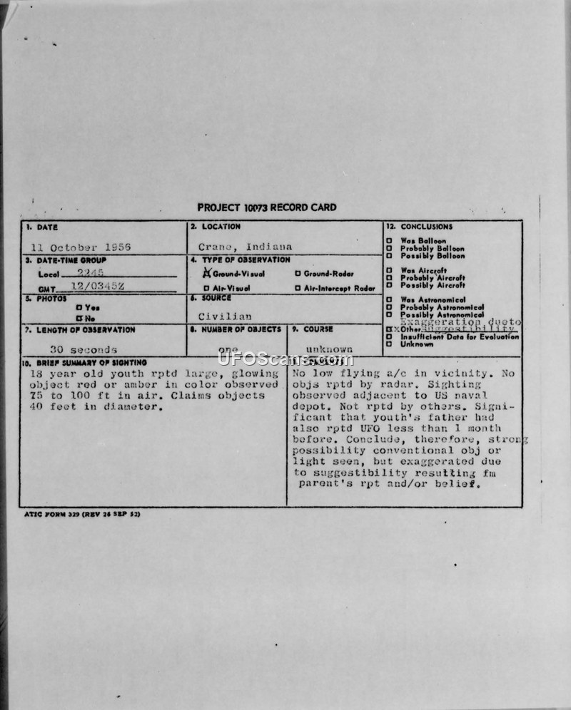 This document collection contains official reports and record cards regarding Unidentified Flying Object (UFO) sightings at the U.S. Naval Ammunition Depot in Crane, Indiana, during October 1956. The primary incident occurred on 11 October 1956, when an 18-year-old youth reported a large, glowing red or amber object, approximately 40 feet in diameter, hovering 75 to 100 feet above the ground. The witness observed the object for 30 seconds before it moved across the depot at a speed comparable to a shooting star. The report notes that no aircraft were in the vicinity and no radar contacts were made. Investigators from the depot, including the Criminal Investigator, noted that the witness's father had also reported a UFO less than a month prior, leading to the conclusion that the sighting might have been a conventional object or light, exaggerated by the youth's suggestibility and his father's prior reports. A subsequent series of sightings occurred on 27 October 1956, involving multiple witnesses, including security guards and a police chief. These witnesses described a luminous object that changed colors like a prism. Following an investigation, these reports were officially attributed to the planet Mars. The final assessment by the depot's legal officer suggested that the descriptions were consistent with celestial bodies, and that atmospheric conditions, specifically a sudden cold snap causing supersaturation and condensation around dust particles, may have increased the brilliance and twinkling effect of these objects. The documents include transmittal letters from the 2466th Air Reserve Flying Center at Bakalar Air Force Base to the Air Defense Command, confirming that these reports were handled in accordance with Air Force Regulation 200-2.