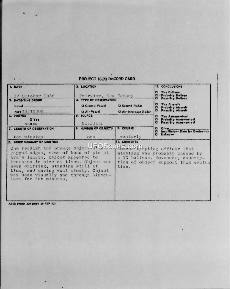 A civilian in Fairview, New Jersey, reported a reddish-orange object on 12 October 1956. Military authorities concluded the object was a weather balloon.