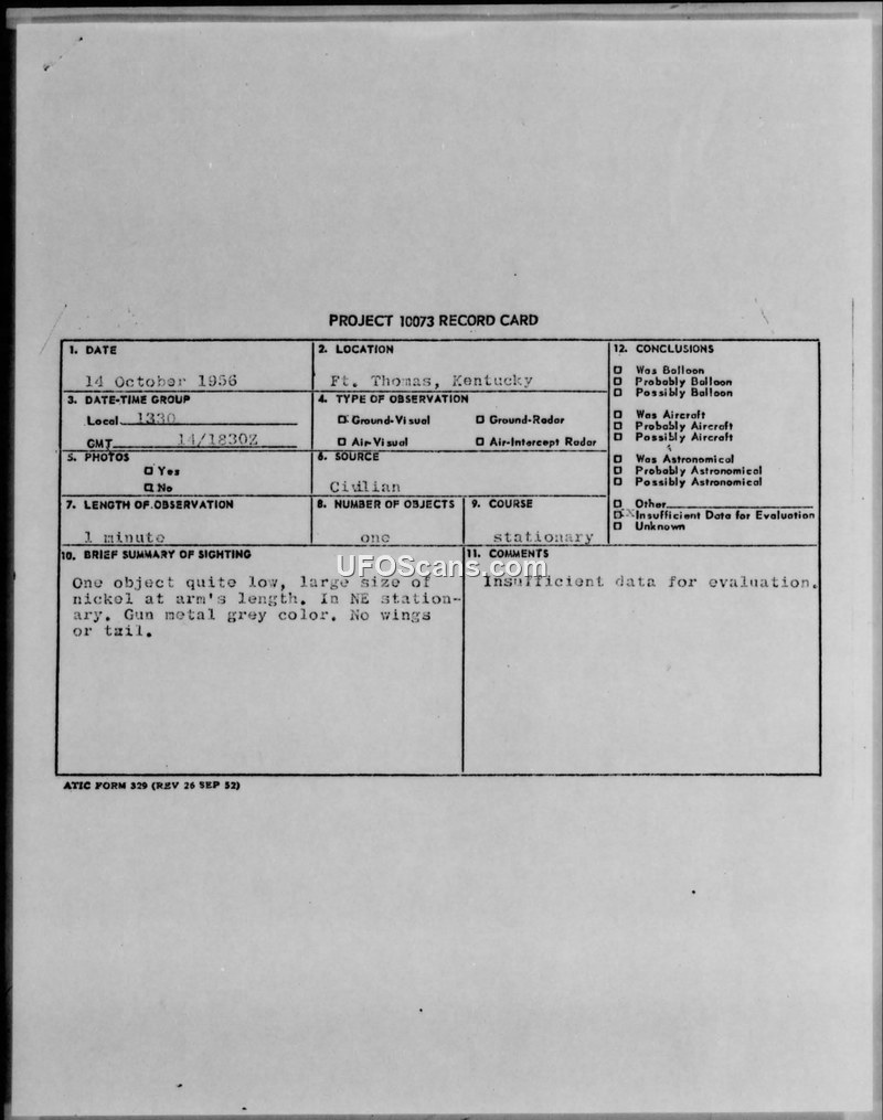 The sighting at Ft. Thomas, Kentucky, on October 14, 1956, involved a stationary, gun-metal grey object described as the size of a nickel at arm's length. The official evaluation concluded there was insufficient data to identify the object.
