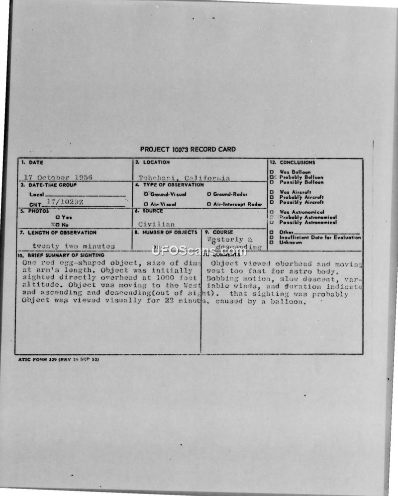 Project 10073 Record Card — Tehachapi, California, 17 October 1956