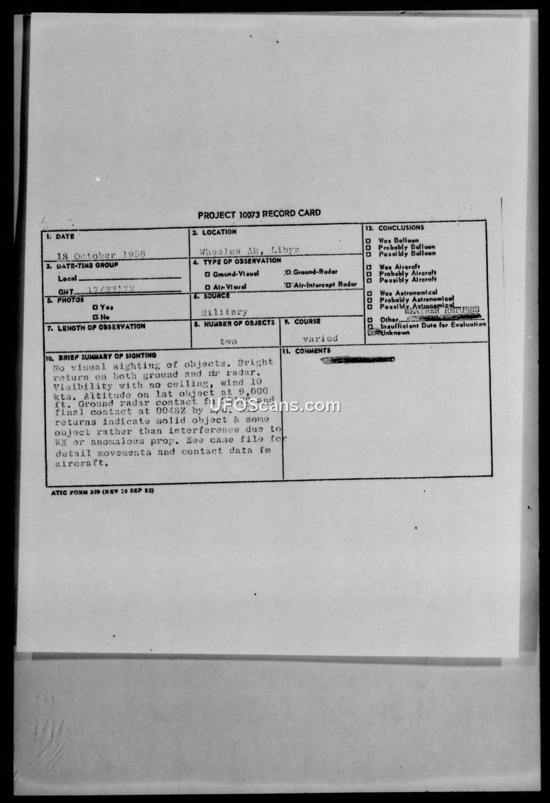 UFO's Detected Near Wheelus AB on 17/18 October 1956