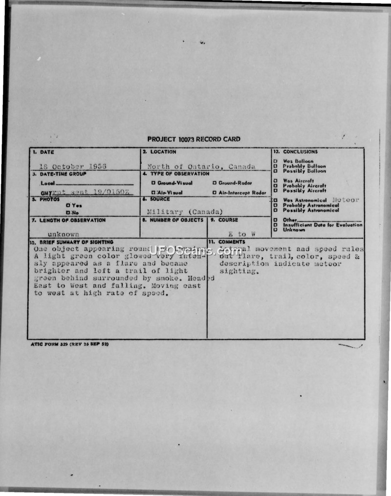 Project 10073 Record Card — North of Ontario, Canada, 18 October 1956