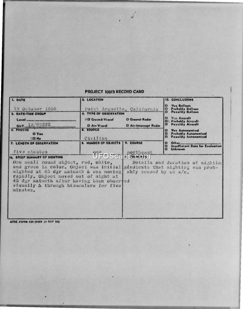 A 1956 sighting report from Point Arguello, California, describes a small, multi-colored object observed for five minutes. While the official conclusion suggests an aircraft, the report notes a lack of information and an unknown cause.