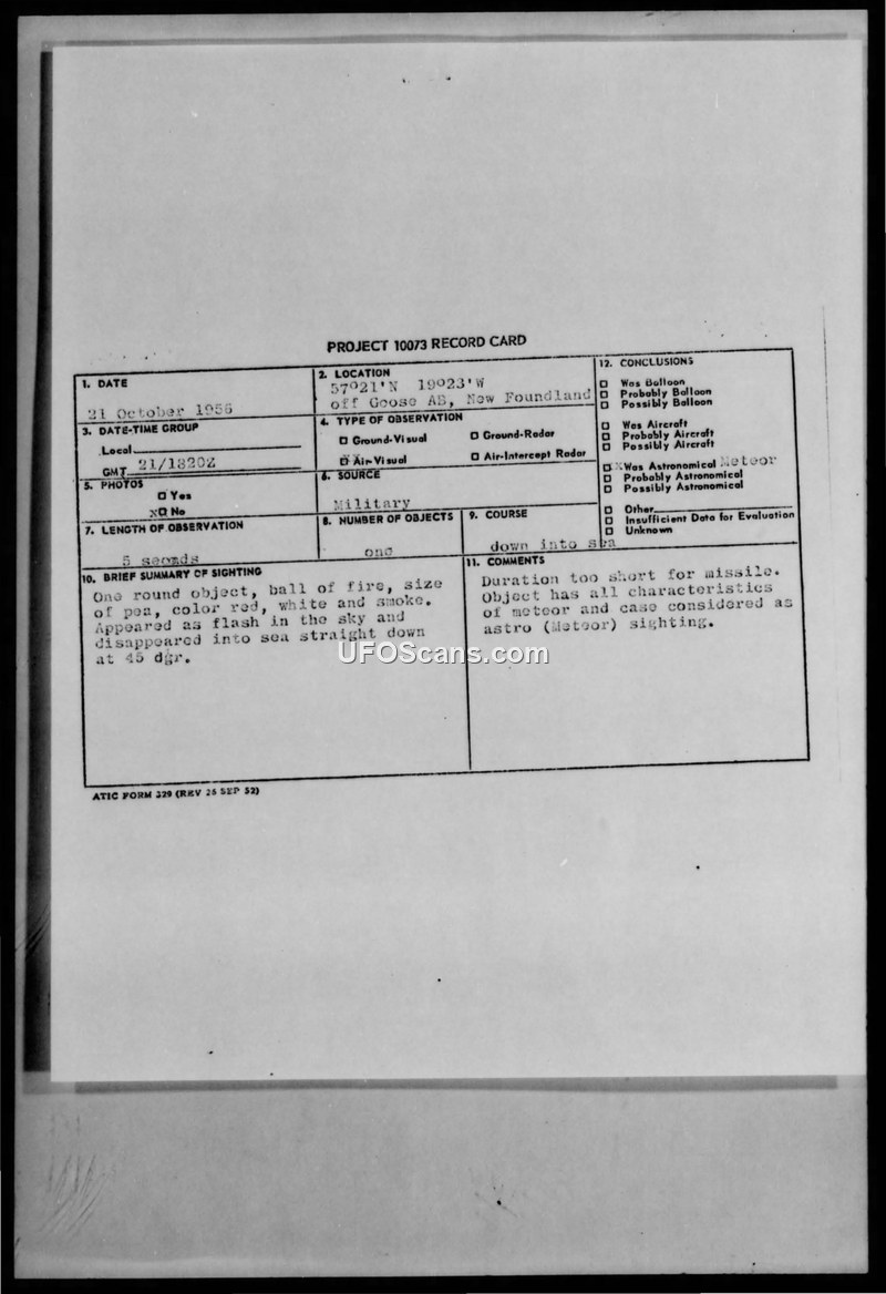 A B-47 crew reported a fireball-like object descending into the sea off Newfoundland on 21 October 1956. While initially classified as a meteor, later military correspondence questioned this, suggesting a possible link to rocket testing by the USS Rushmore.