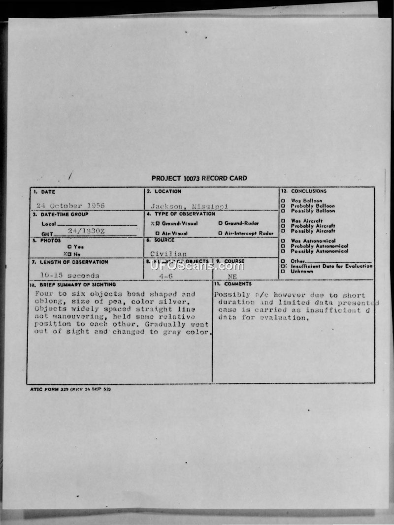 Project 10073 Record Card: Sighting in Jackson, Mississippi, 24 October 1956