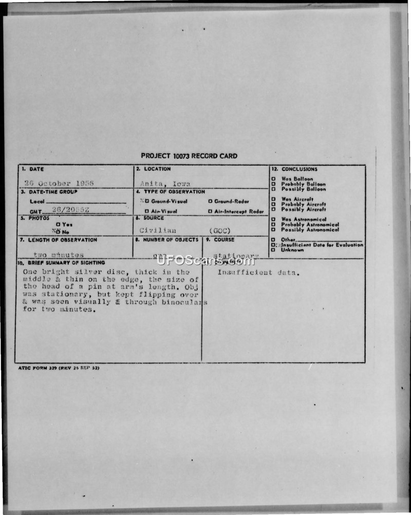 A civilian reported a stationary, flipping silver disc in Anita, Iowa, on October 26, 1956. The official military evaluation concluded there was insufficient data to identify the object.