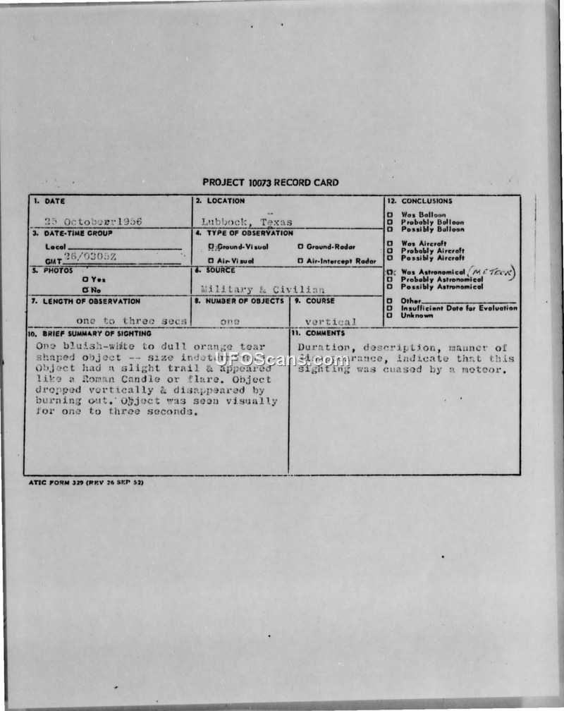 A sighting of a tear-shaped, burning object over Lubbock, Texas, on October 25, 1956, was reported by military personnel. The Air Technical Intelligence Center concluded the object was a meteor.