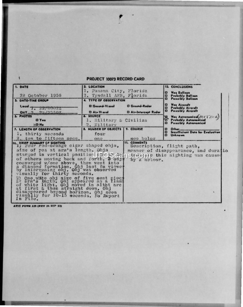 Project 10073 Record Card — 28 October 1956, Panama City, Florida