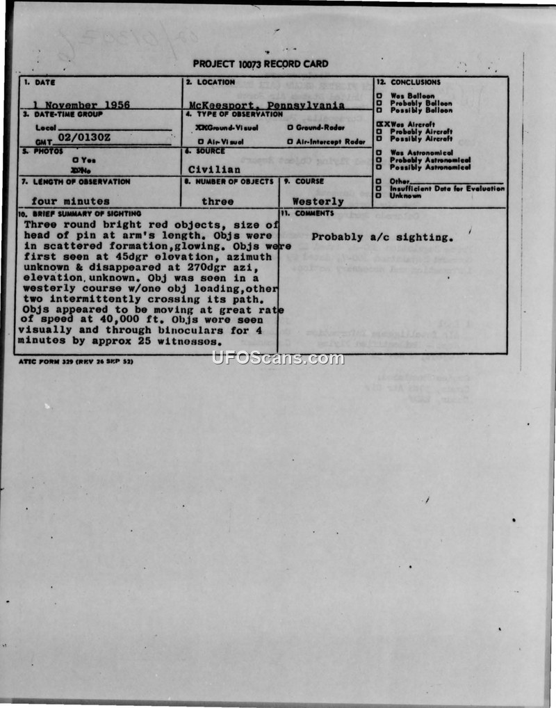 A report of three glowing red objects seen by 25 witnesses in McKeesport, PA, on 1 November 1956. Military investigation found no radar confirmation and concluded it was likely an aircraft sighting.