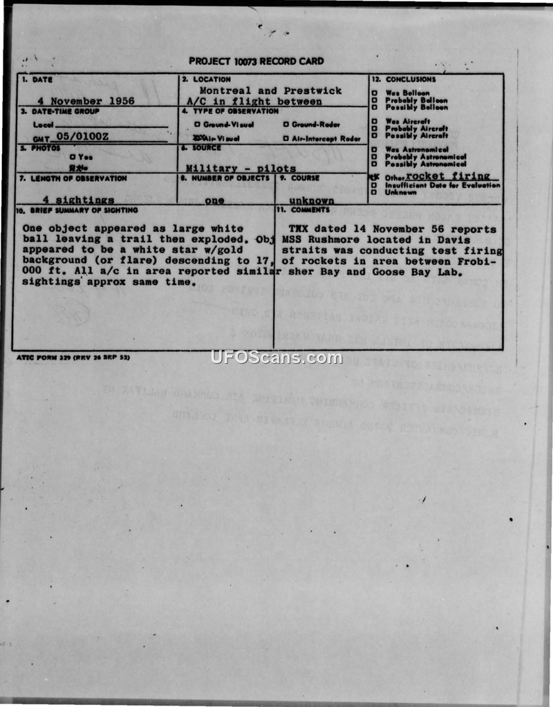 This document consists of a Project 10073 record card and associated teletype communications regarding an unidentified aerial phenomenon reported on November 4, 1956. Military pilots flying between Montreal and Prestwick reported observing a large white ball that left a trail before exploding. The object appeared to have a white star with a gold background or flare and was observed descending to an altitude of 17,000 feet. The 922nd ACW Squadron received three similar reports from aircraft in the same vicinity. Additionally, an Icelandic DC-4 aircraft en route to Goose Bay from Keflavik reported seeing an object northwest of its position, approximately 50 miles south of Ocean Station Bravo, which it described as a large white ball that left a trail and then exploded. Following an evaluation of the reports, the official conclusion reached by the Air Technical Intelligence Center (ATIC) was that the sightings were likely the result of rocket test firings conducted by the USS Rushmore. A teletype dated November 14, 1956, confirmed that the USS Rushmore was located in the Davis Straits and was conducting test firings of rockets in the area between Frobisher Bay and Goose Bay, Labrador, at the time of the sightings. The documentation includes internal military correspondence routing the report between various commands, including the 64th Air Division, the Air Defense Command, and the Directorate of Intelligence at USAF Headquarters, to ensure the incident was properly evaluated and attributed to the known military activity.