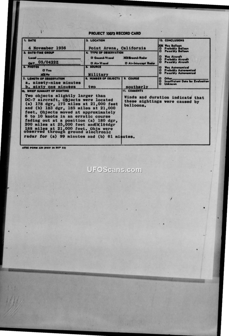 PROJECT 10073 RECORD CARD — Point Arena, California, 4 November 1956
