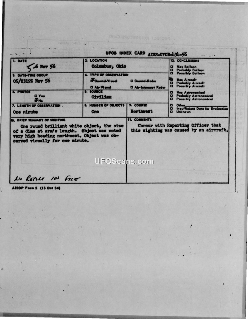 UFO Index Card — Columbus, Ohio, 5 November 1956