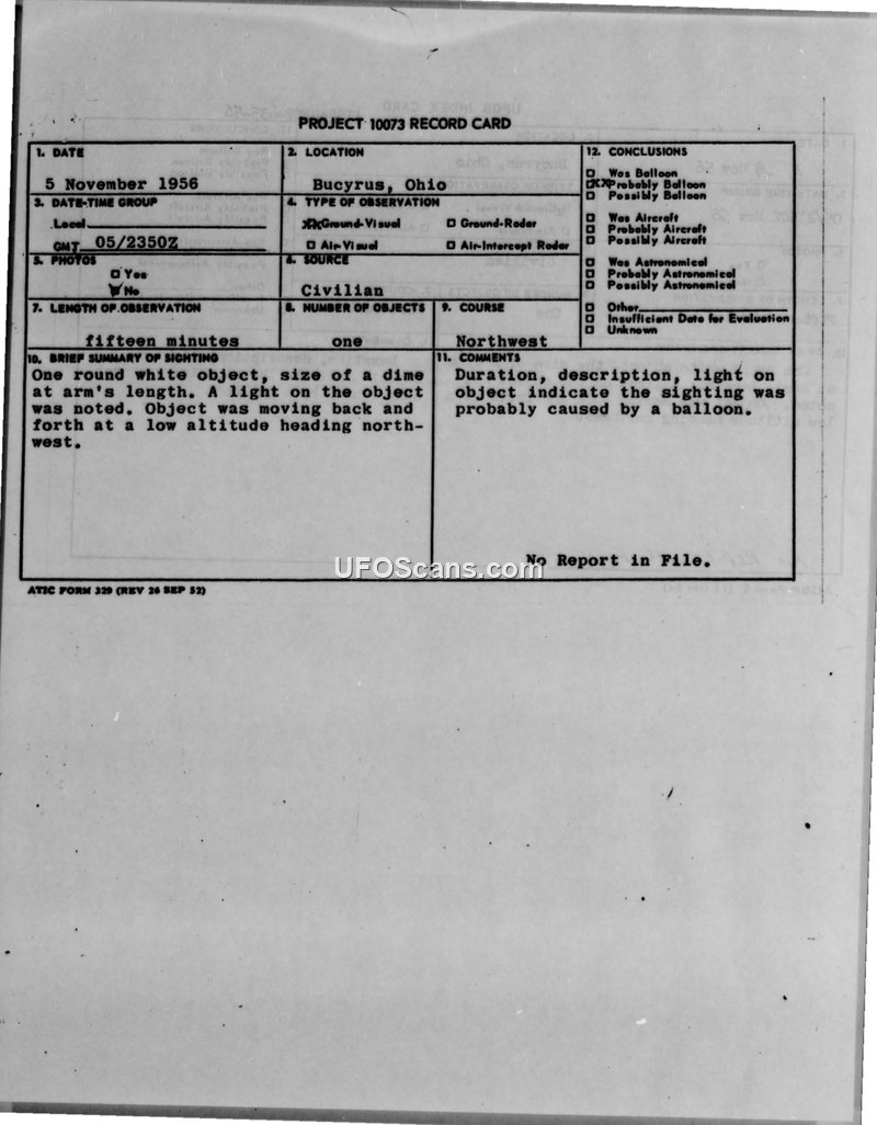 Project 10073 Record Card — Bucyrus, Ohio, 5 November 1956