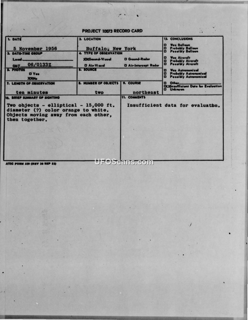 Project 10073 Record Card — Buffalo, New York, 5 November 1956