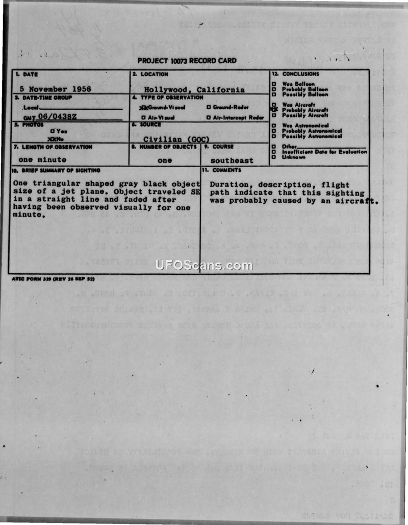 PROJECT 10073 RECORD CARD — Sighting Report, Hollywood, California, 5 November 1956
