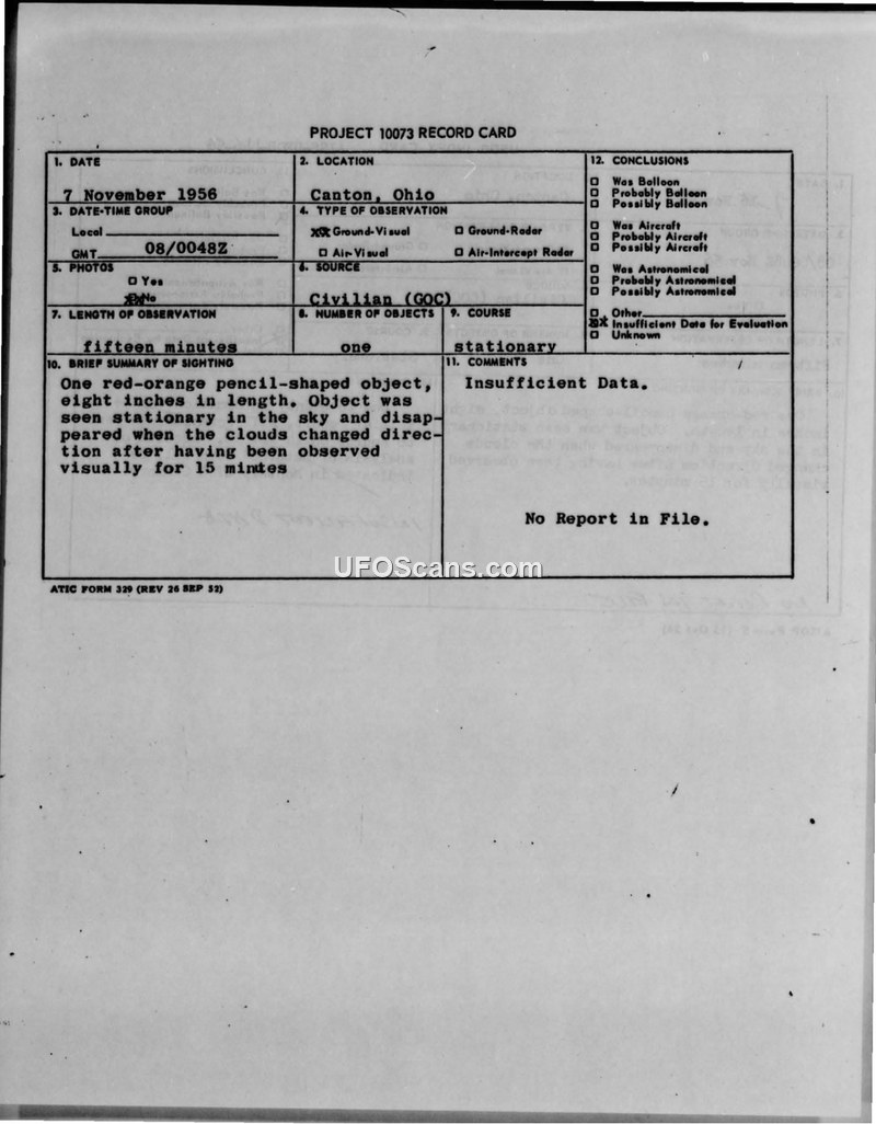 PROJECT 10073 RECORD CARD — Canton, Ohio, 7 November 1956
