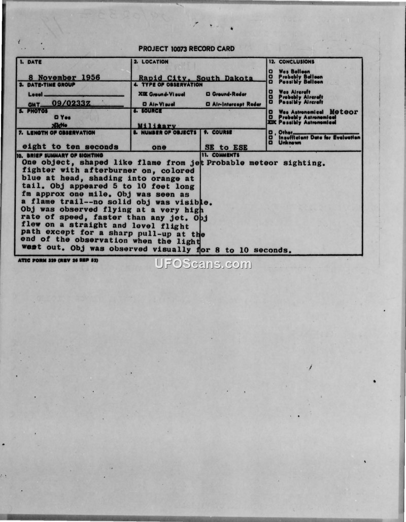 PROJECT 10073 RECORD CARD - 8 November 1956 - Rapid City, South Dakota