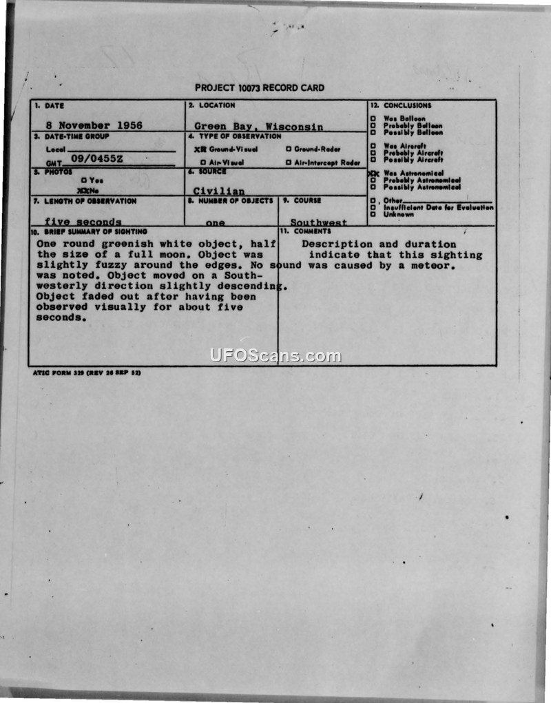 A civilian in Green Bay, Wisconsin, reported a greenish-white object on 8 November 1956. The Air Technical Intelligence Center concluded the object was a meteor.