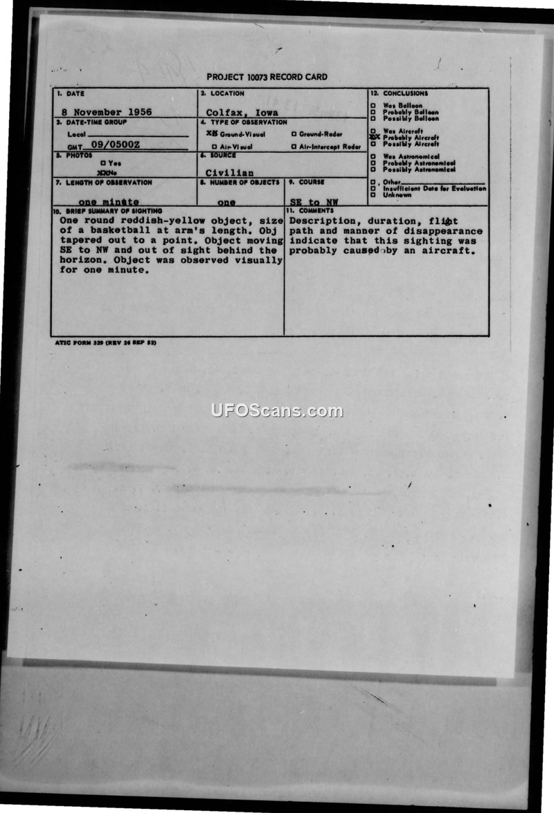 Project 10073 Record Card — Colfax, Iowa, 8 November 1956