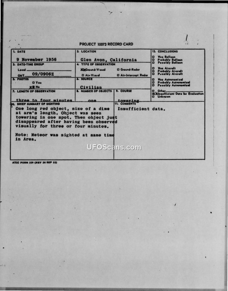 A civilian report of a red object in Glen Avon, California, on 9 November 1956, which was officially classified as 'insufficient data' by the Air Technical Intelligence Center. The report notes a concurrent meteor sighting in the area.