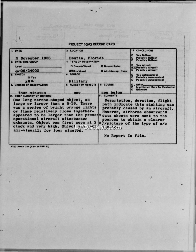 An intelligence report detailing a 1956 sighting of a large, orange-lit object near Eglin Air Force Base. The military concluded the object was likely an aircraft.
