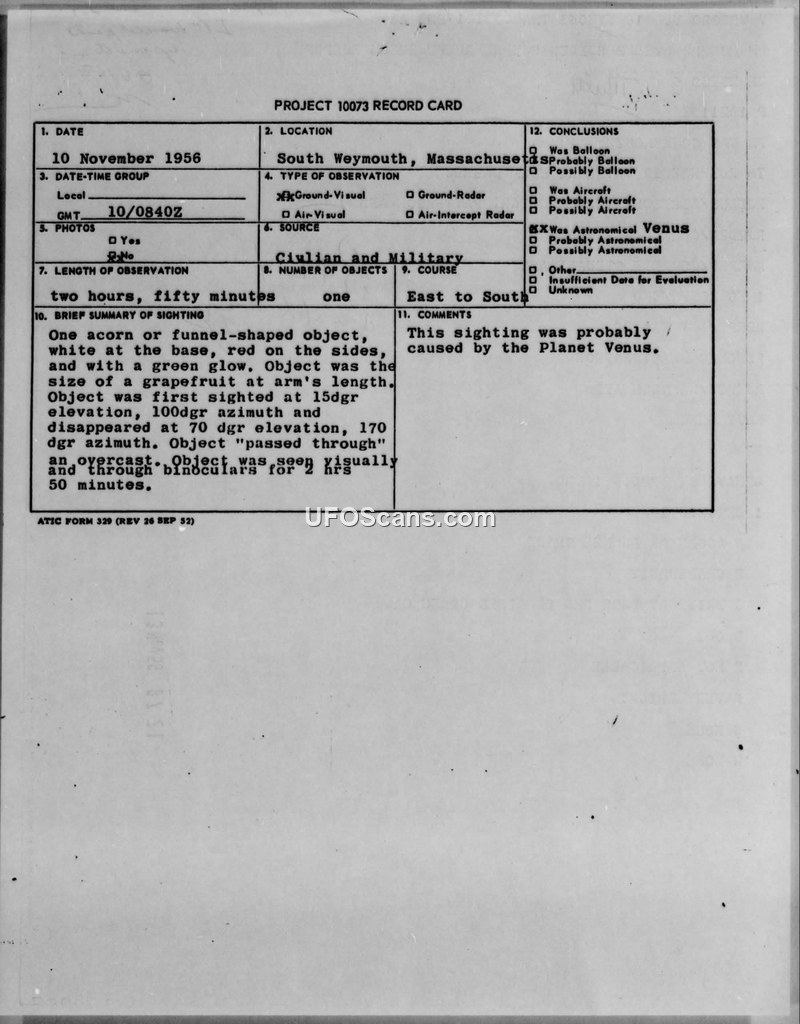 On November 10, 1956, two civilian guards stationed at the United States Naval Air Station (USNAS) in South Weymouth, Massachusetts, reported observing an unidentified aerial object for a duration of two hours and fifty minutes. The sighting began at 0840Z. The witnesses described the object as having an acorn or funnel-like shape, characterized by a white base, red sides, and a distinct green glow. At arm's length, the object appeared to be the size of a grapefruit. The observers tracked the object as it moved from an easterly to a southerly direction, with its altitude estimated between 2,000 and 12,000 feet. The object was observed both visually and through 7x50 binoculars. The witnesses noted that the object appeared to pass through an overcast layer. Following the initial report, the Fourth Cliff Radar Research site was contacted at 0127 EST to determine if any radar returns correlated with the visual sighting; however, they reported no known air traffic in the area at the time. The operations officer at USNAS South Weymouth conducted a preliminary analysis and stated there was no known cause for the sighting. Despite the detailed observations provided by the guards, the official conclusion recorded on the Project 10073 record card attributed the sighting to the planet Venus. The report includes teletype correspondence detailing the specific characteristics of the object, the weather conditions at the time, and the administrative routing of the report to various military commands, including Air Technical Intelligence Center at Wright-Patterson AFB and the Air Defense Command at Ent AFB.